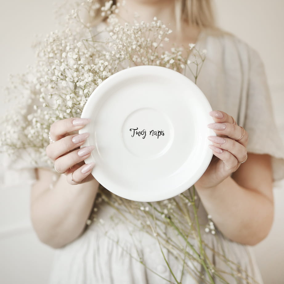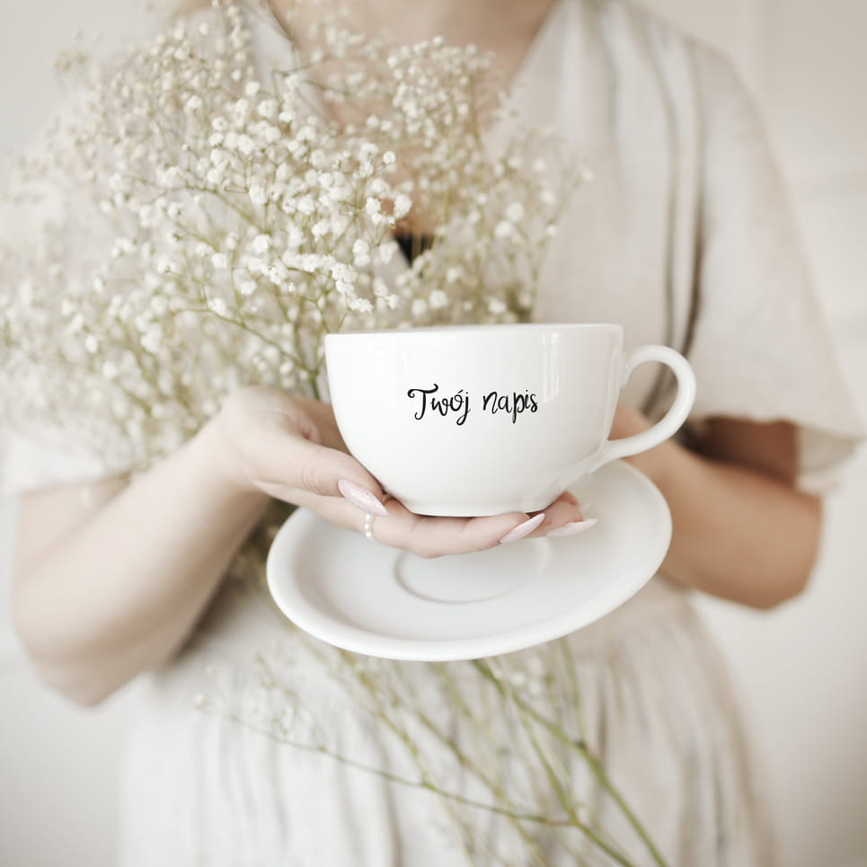 Biała Filiżanka Porcelanowa z Talerzykiem z Personalizacją 350 ml - Twój Napis dla Bliskiej Osoby na Każdą Okazję