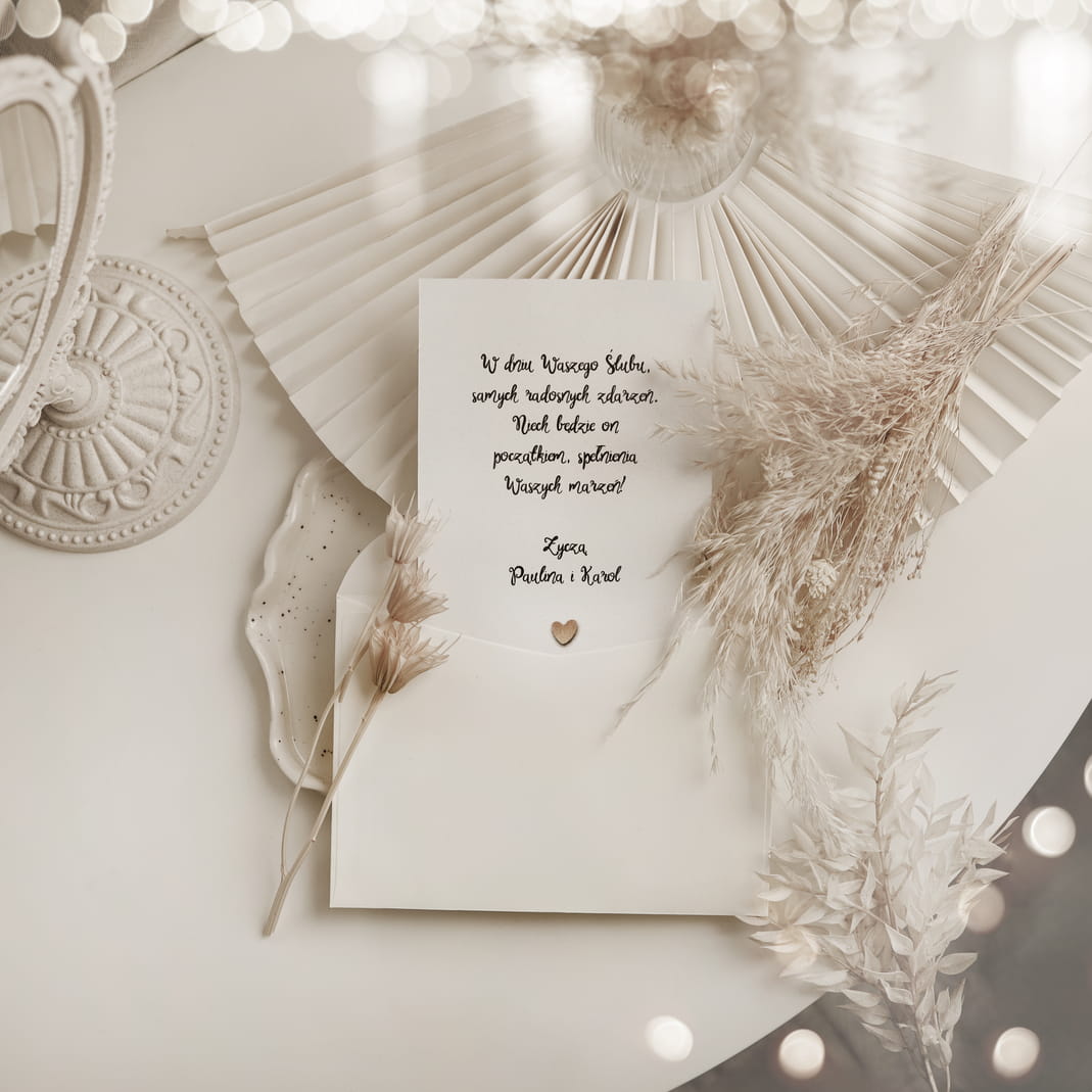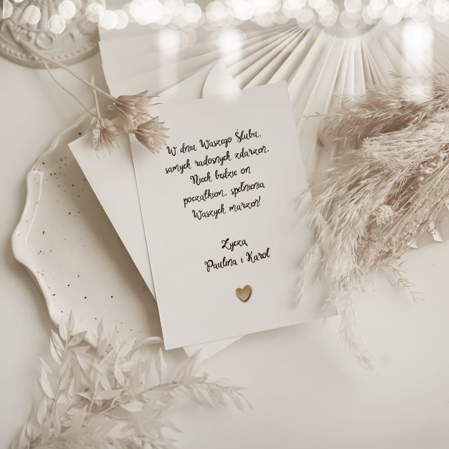 Kartka porządkuje cały gest: nawet drobny upominek zyskuje „ramę” i bardziej osobisty charakter.