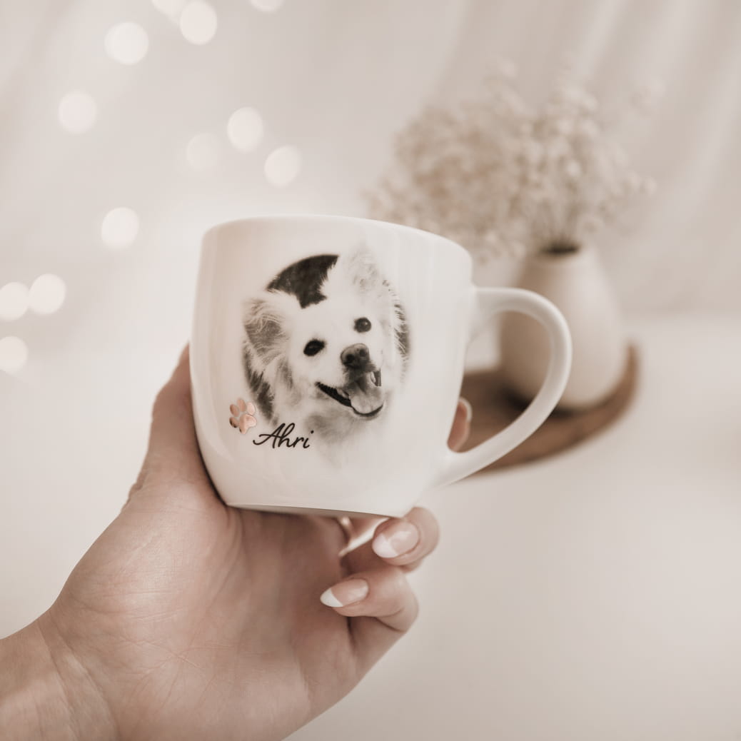 Informacje dodatkowe: możliwość dodania zdjęcia pupila, jego imienia oraz krótkiego napisu przy wewnętrznej krawędzi. Na porcelanie umieszczany jest pyszczek zwierzaka, bez całej sylwetki; jakość efektu zależy od jakości przesłanego zdjęcia. Kubek ze złoceniem można myć w zmywarce do 60°C, ale nie należy używać go w mikrofalówce.