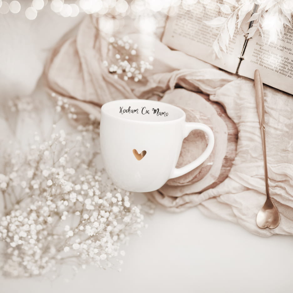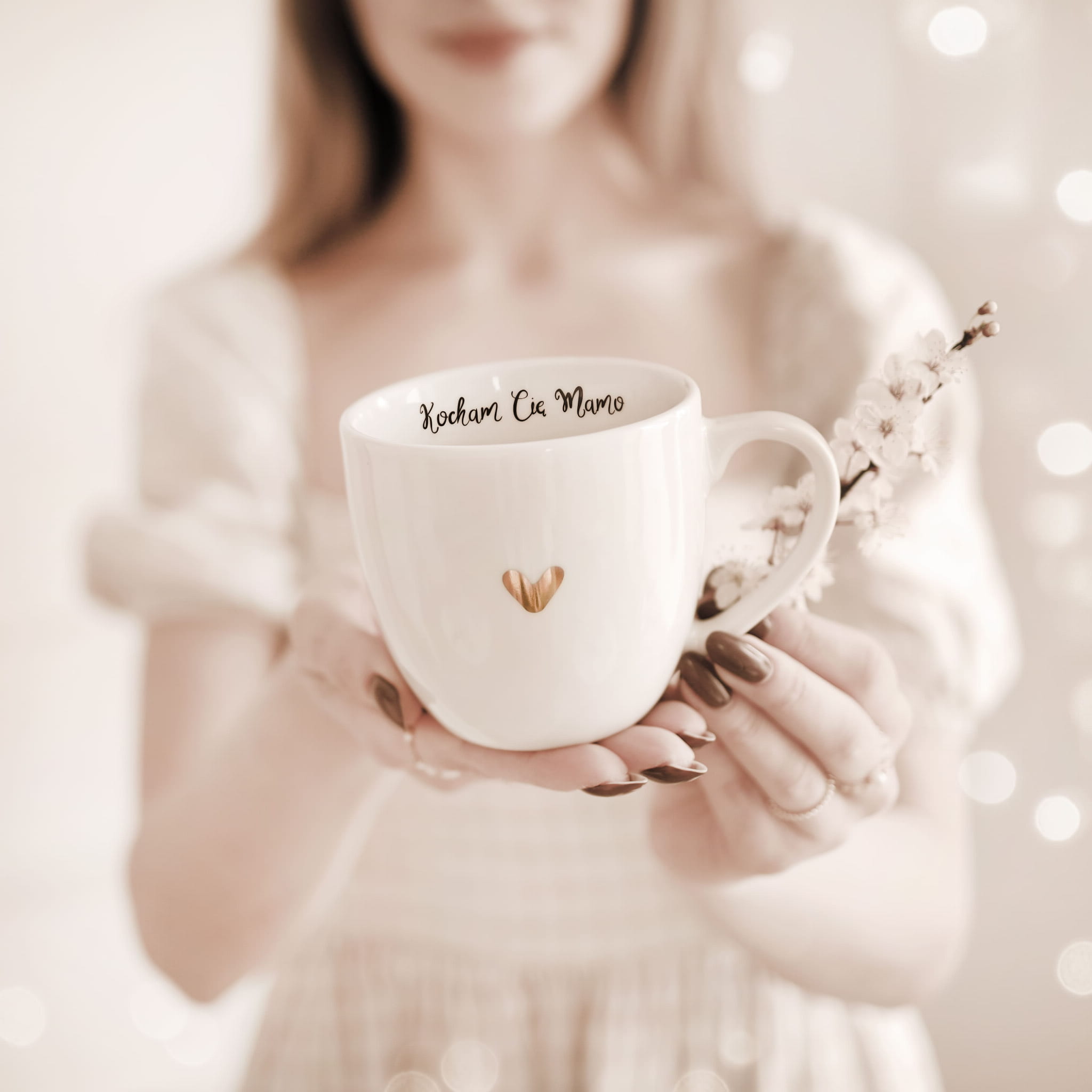 Biały kubek porcelanowy 300 ml - napis kocham cię mamo wewnątrz ze złotym sercem na dzień matki dla mamy