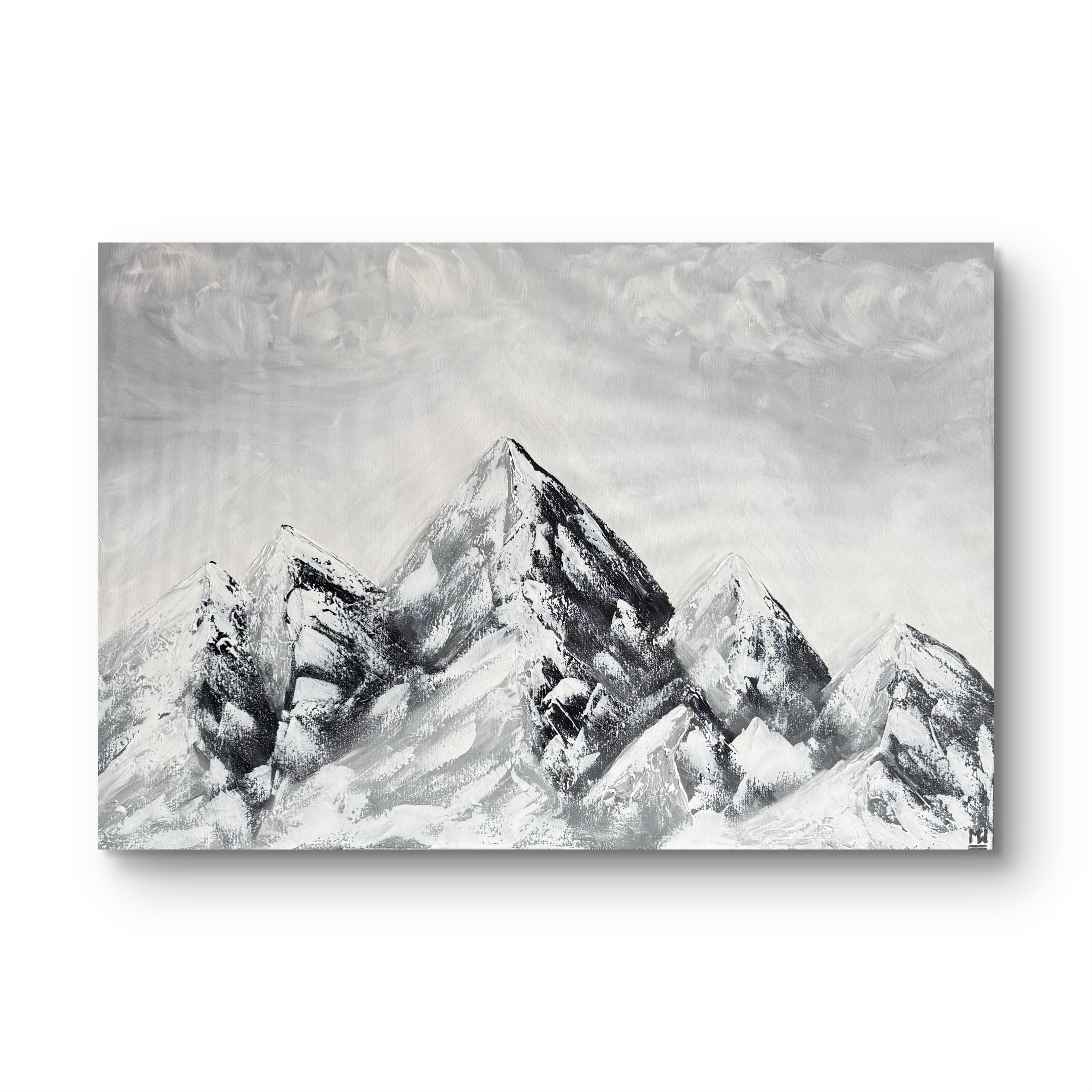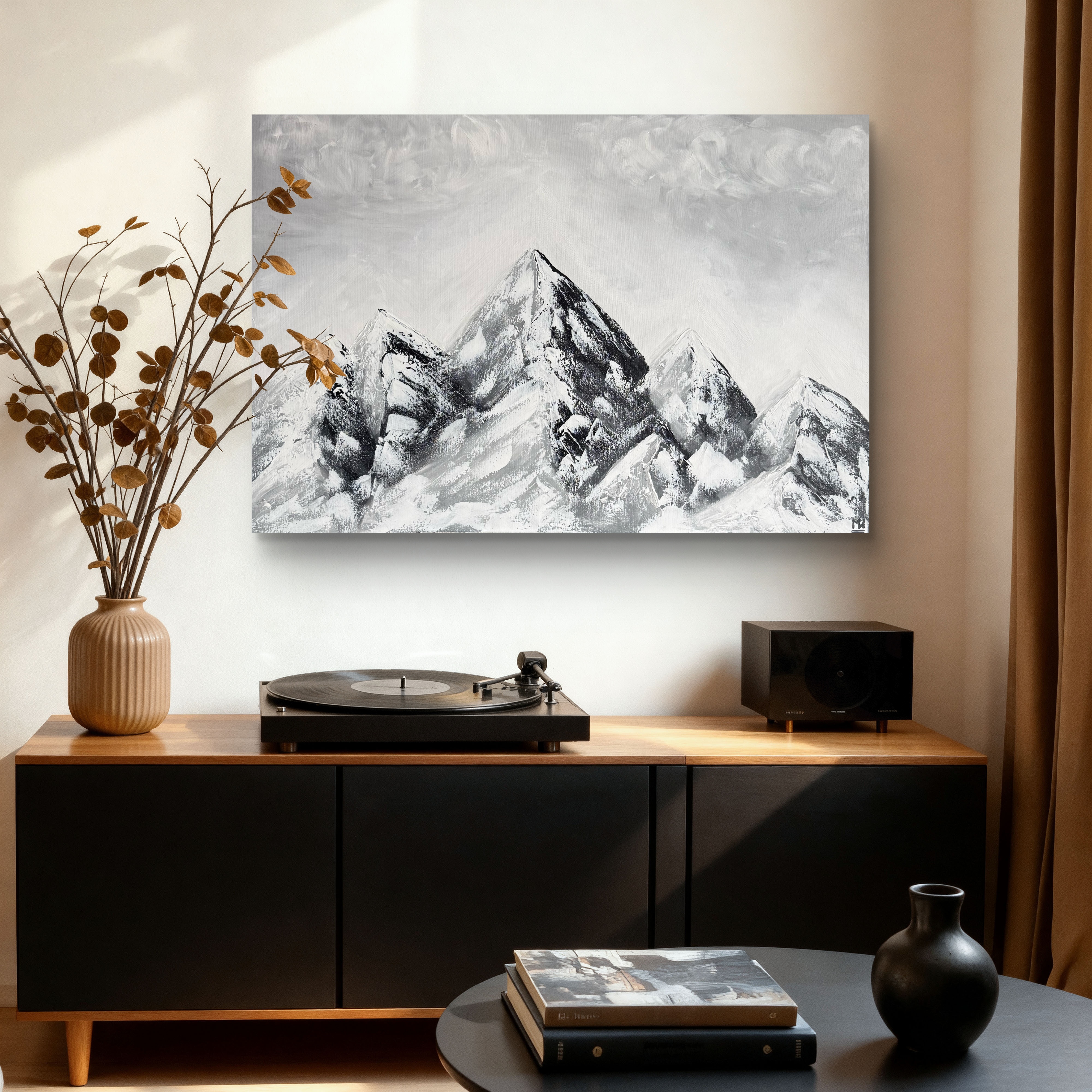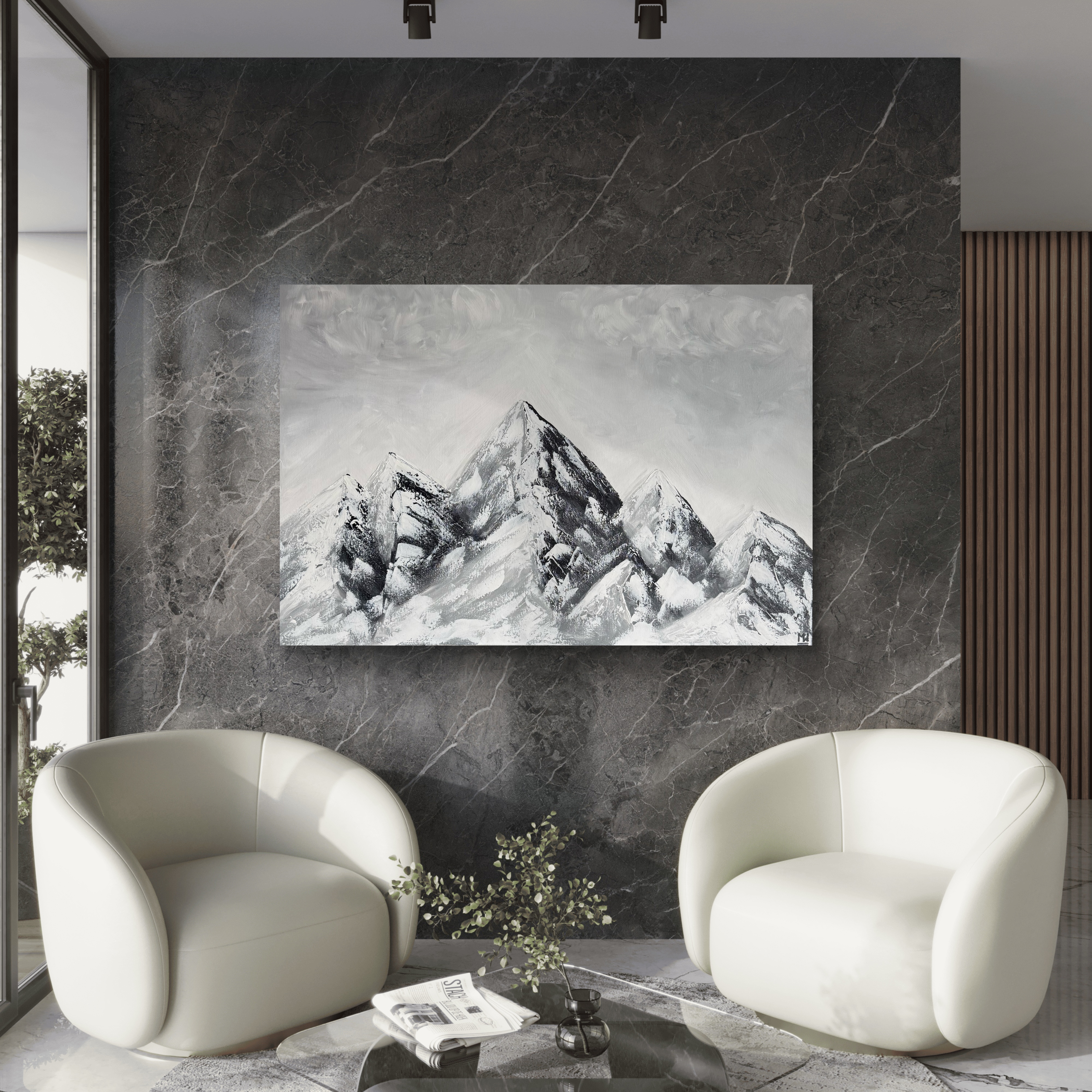 Subtelny, a jednocześnie wyrazisty obraz przedstawiający majestatyczne, ośnieżone góry zanurzone w ciszy i spokoju. Monochromatyczna paleta barw – od głębokiej czerni po delikatne odcienie bieli i szarości – nadaje kompozycji elegancki, ponadczasowy charakter, który doskonale wpisuje się w nowoczesne i minimalistyczne wnętrza. Obraz idealnie wpasuje się na jasną ścianę w salonie nad kanapę, nad łóżko lub w korytarzu.