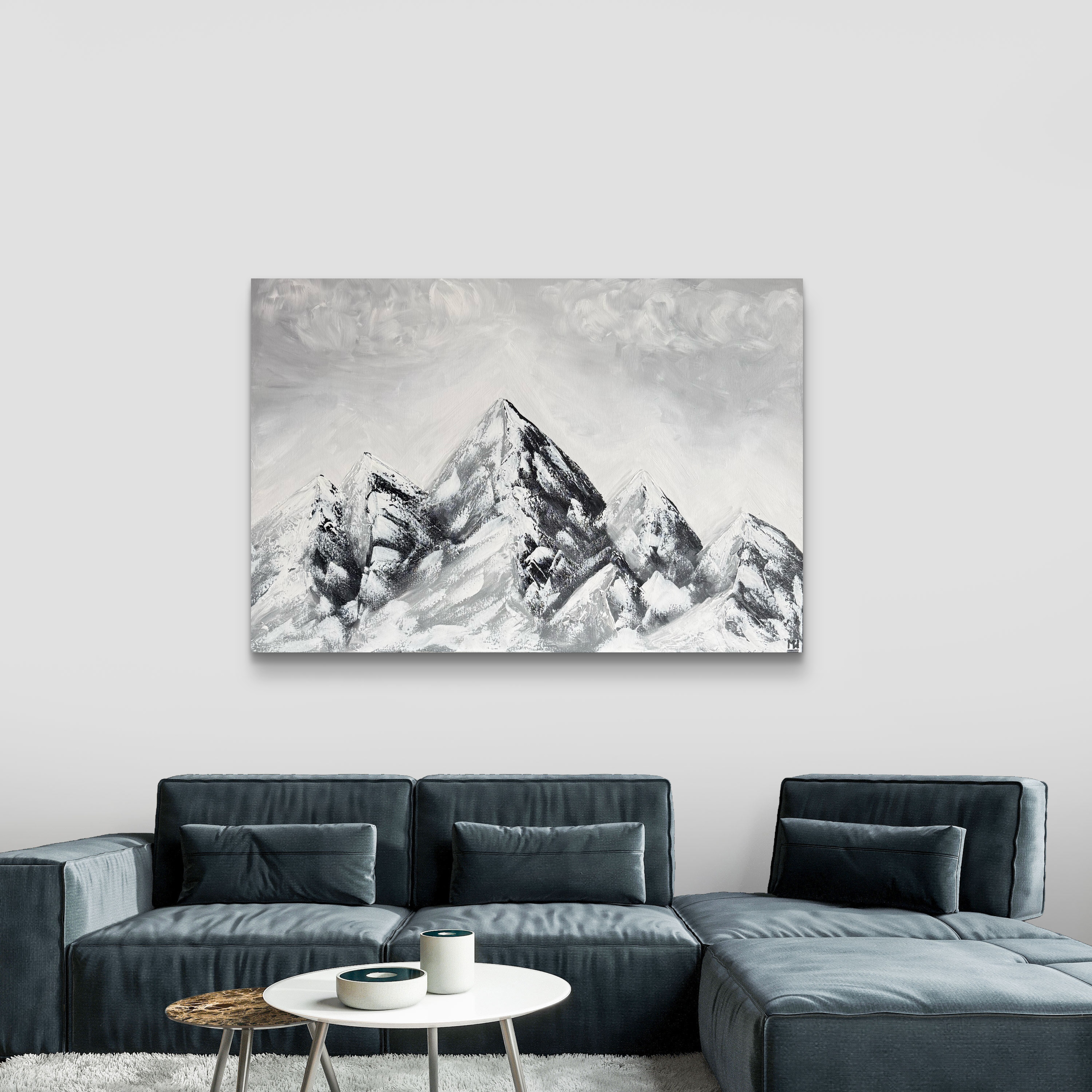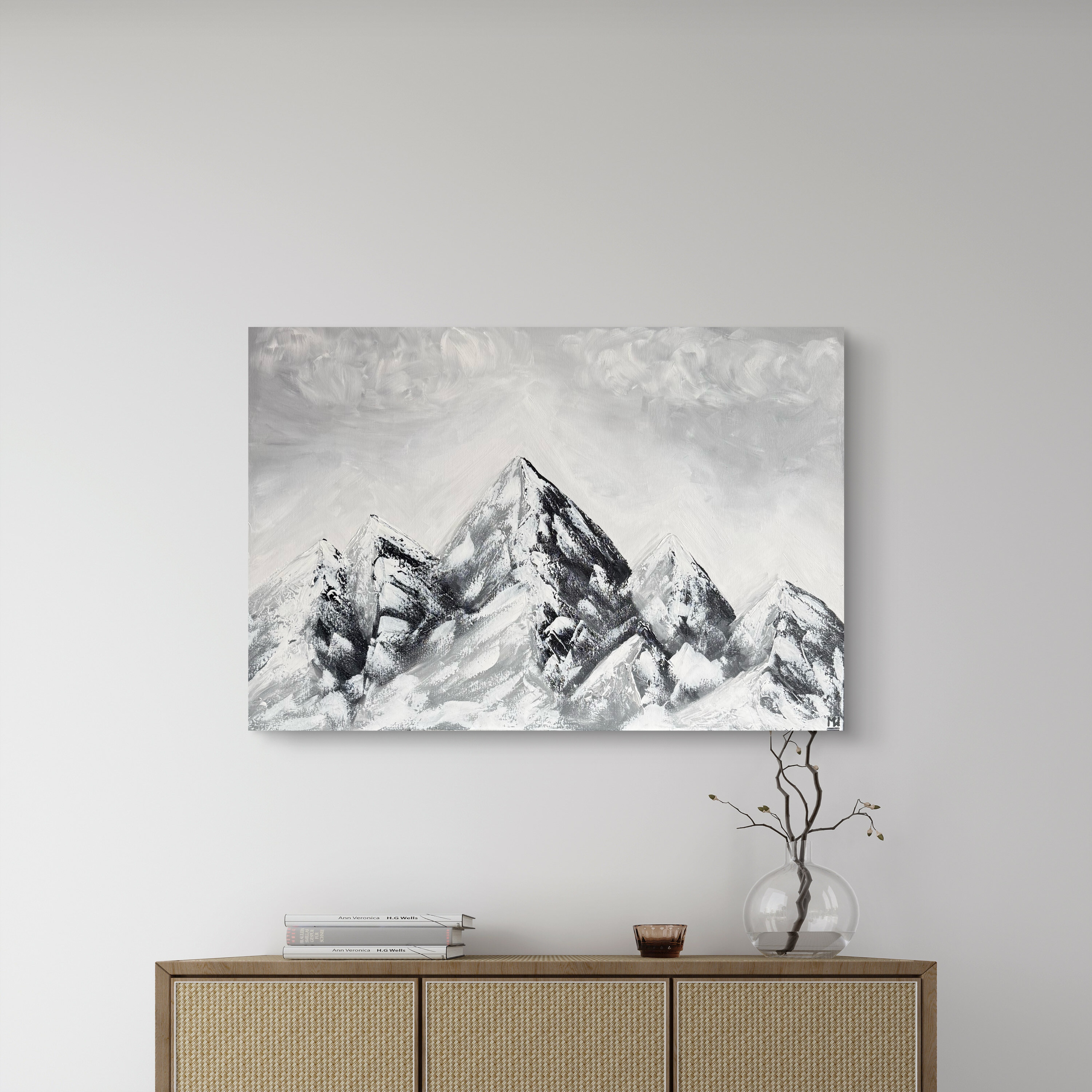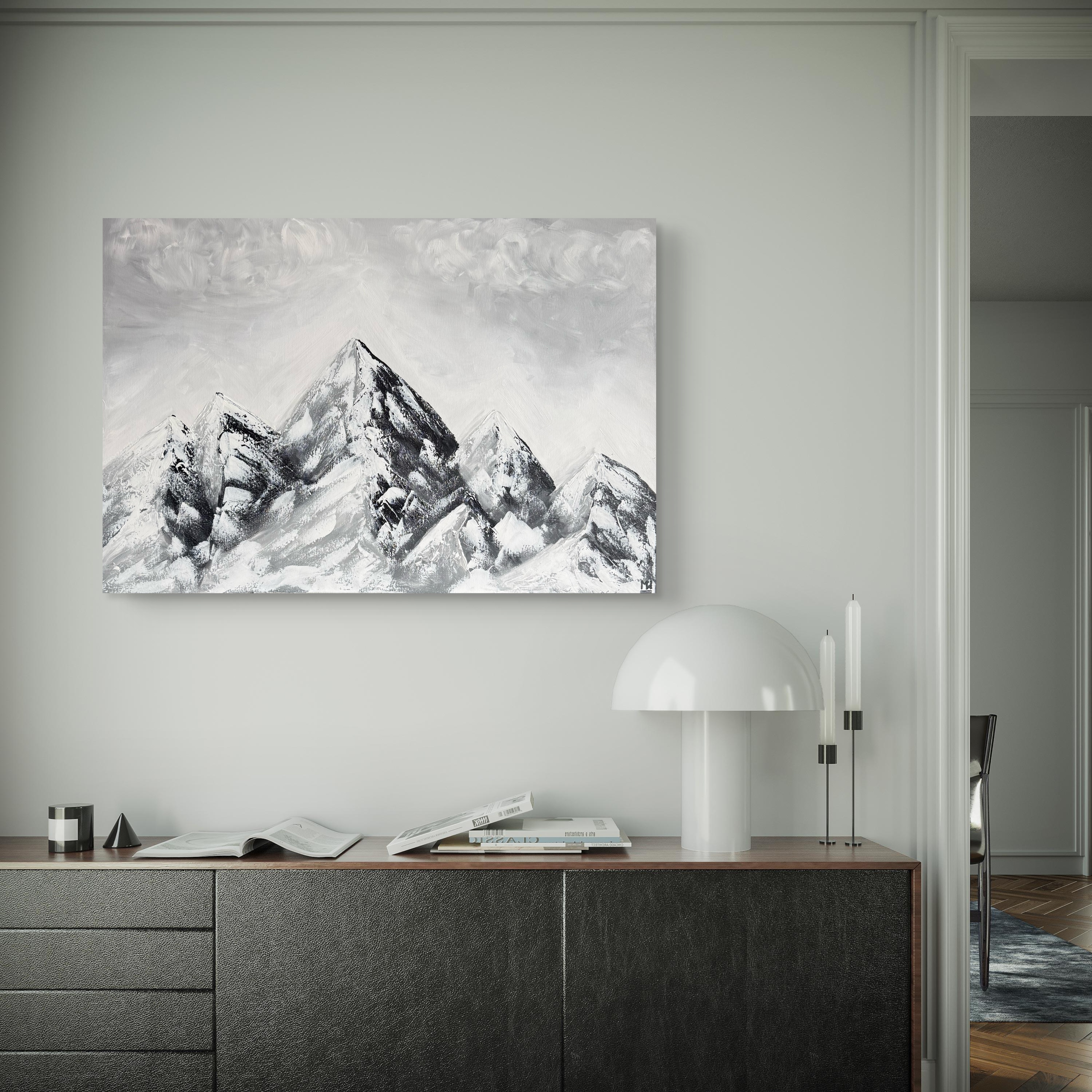 Subtelny, a jednocześnie wyrazisty obraz przedstawiający majestatyczne, ośnieżone góry zanurzone w ciszy i spokoju. Monochromatyczna paleta barw – od głębokiej czerni po delikatne odcienie bieli i szarości – nadaje kompozycji elegancki, ponadczasowy charakter, który doskonale wpisuje się w nowoczesne i minimalistyczne wnętrza. Obraz idealnie wpasuje się na jasną ścianę w salonie nad kanapę, nad łóżko lub w korytarzu.