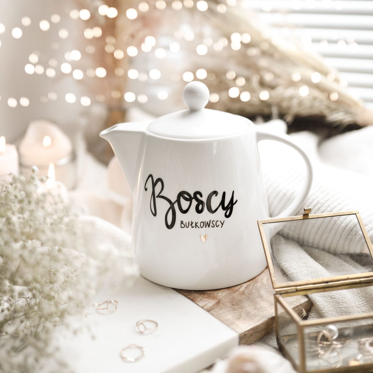 Panny młode często nie mogą się doczekać momentu, w którym po raz pierwszy użyją nazwiska męża. Możesz przybliżyć parze młodej ten moment, podarowując im w prezencie dzbanek z napisem Boscy i z ich nazwiskiem. To miły i praktyczny prezent, który sprawi, że podczas rytuałów kawowo-herbacianych będą tworzyli swoje wspomnienia.