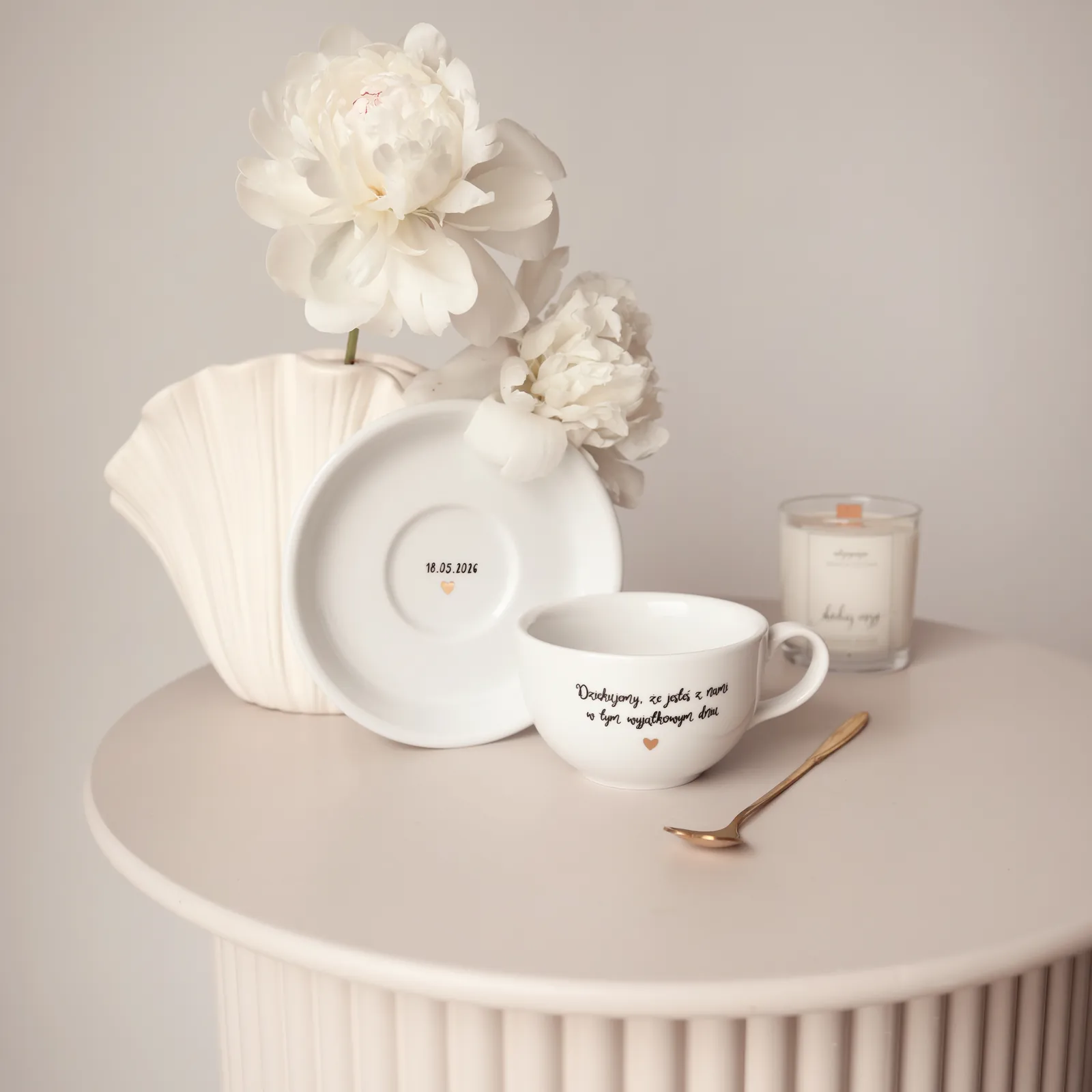 - Gotowy napis na filiżance: "Dziękujemy, że jesteś z nami w tym wyjątkowym dniu"