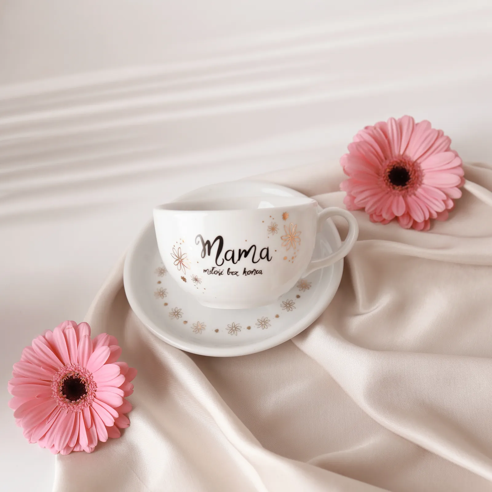 Filiżanka 250 ml ze spodkiem, z napisem "Mama miłość bez końca" i motywem złotych stokrotek na filiżance i spodku. Ręcznie zdobiona w naszej pracowni w Białymstoku, ze złoceniem prawdziwym złotem.