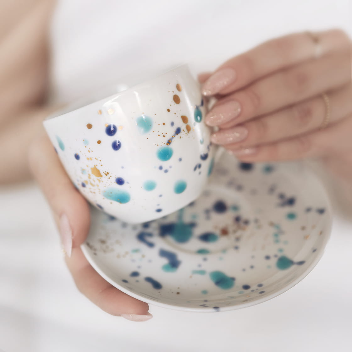 Ręcznie malowana filiżanka 200 ml ze spodkiem z CIENKIM RANTEM - Błękitne kropki ZDOBIONA ZŁOTEM
