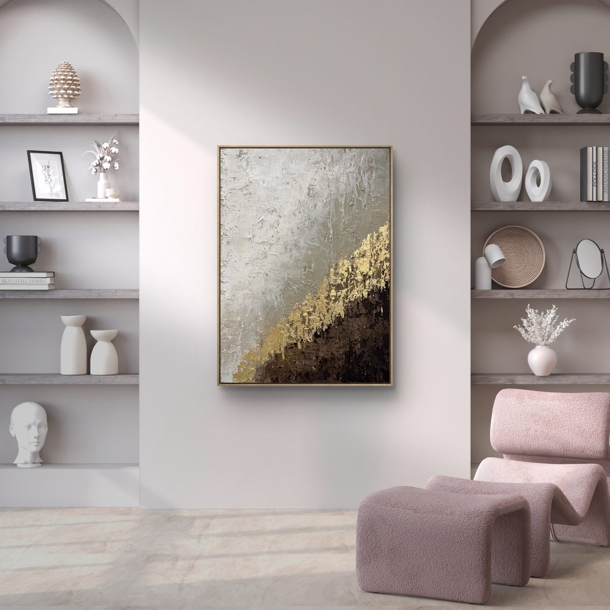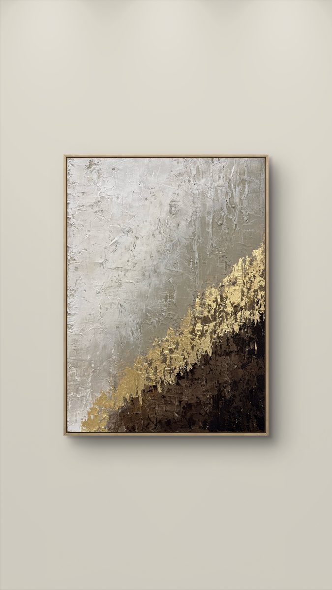 Abstrakcyjność obrazu podkreśla jego wyjątkowe wykonanie, która nadaje mu głębi i charakteru. Złote akcenty dodają całości luksusowego wykończenia, przyciągając wzrok i wnosząc odrobinę blasku do przestrzeni.