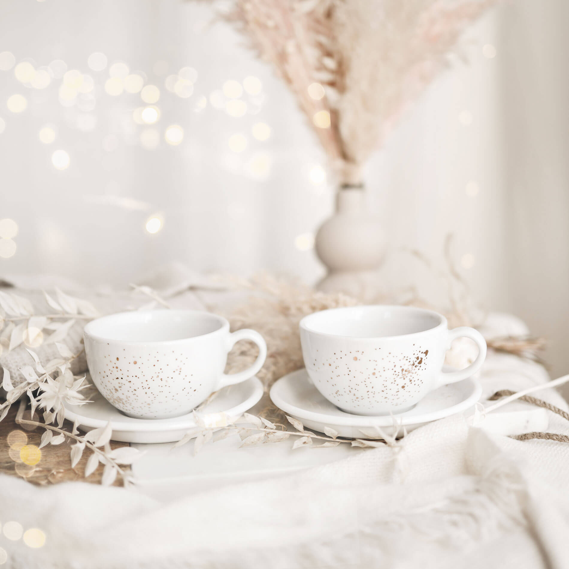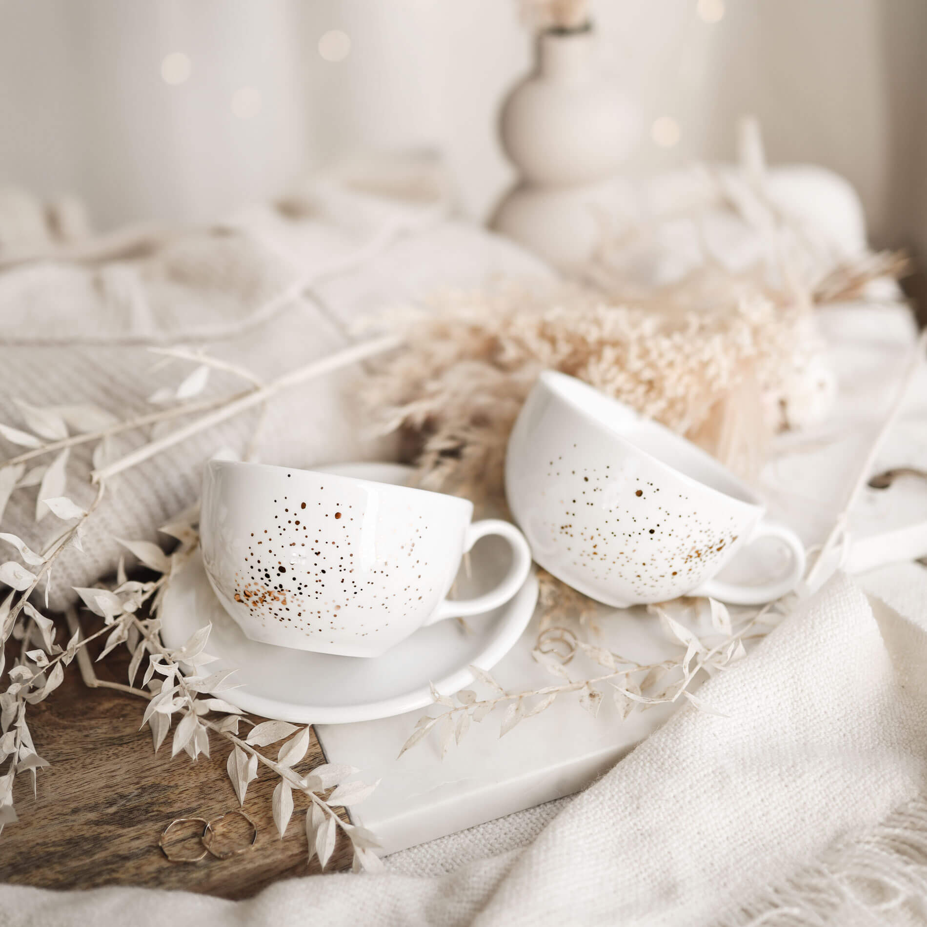 Zestaw 2 białych filiżanek porcelanowych 250 ml ze spodkami - motyw nakrapiania złotem dla pary na rocznicę ślubu