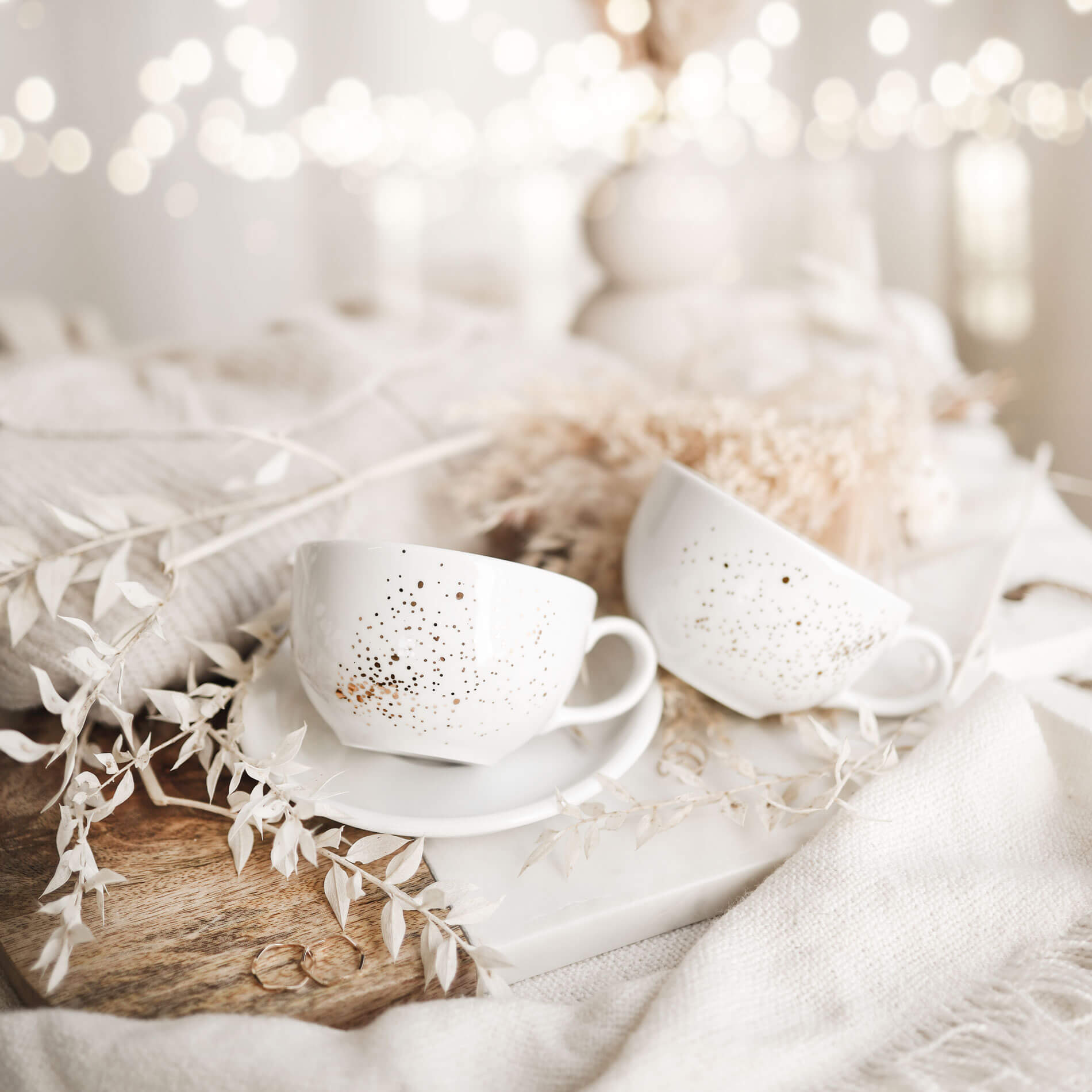 - Bliscy przyjaciele, którzy wspólnie spędzają poranki — porcelana z nakrapianiem złotem podkreśla wagę codziennego rytuału