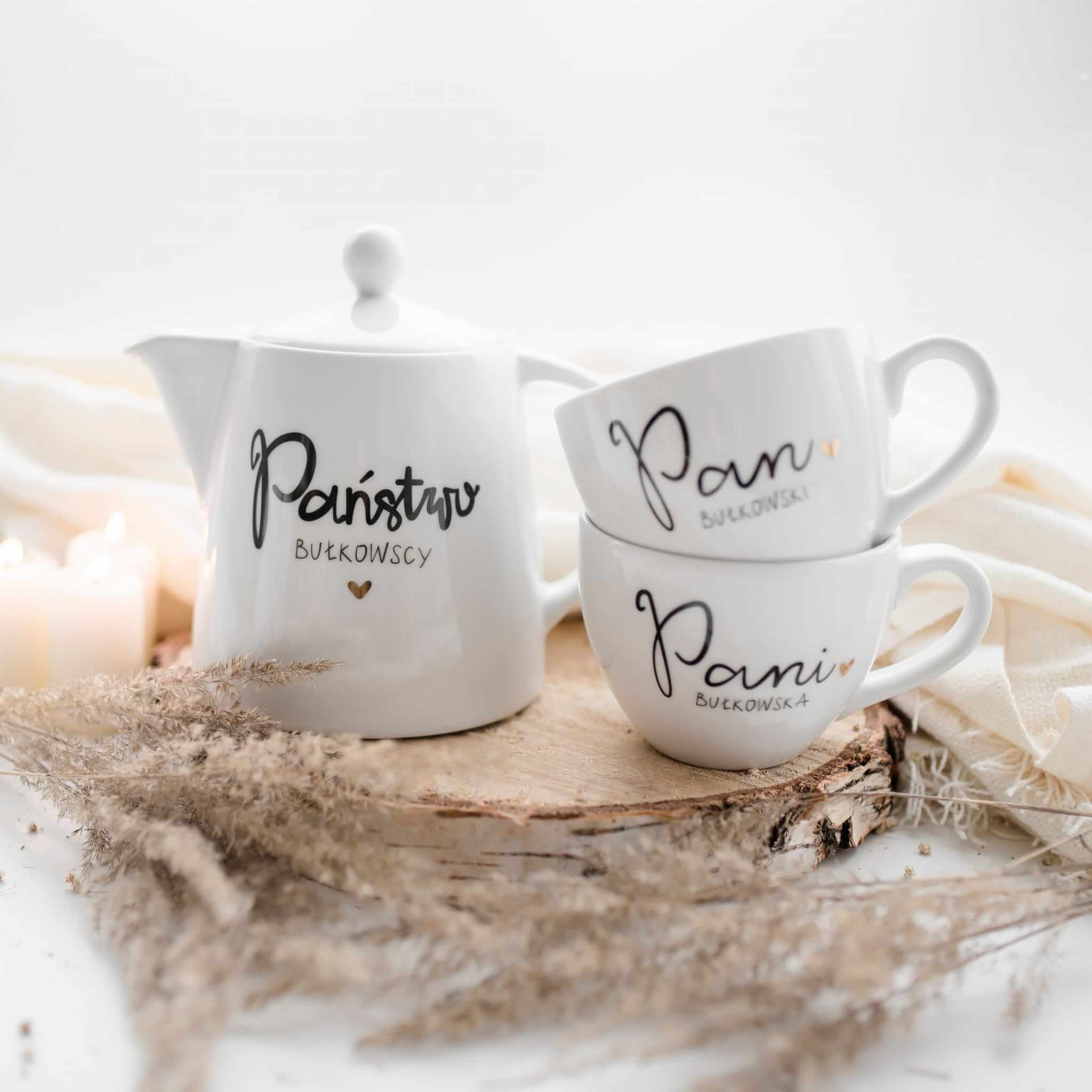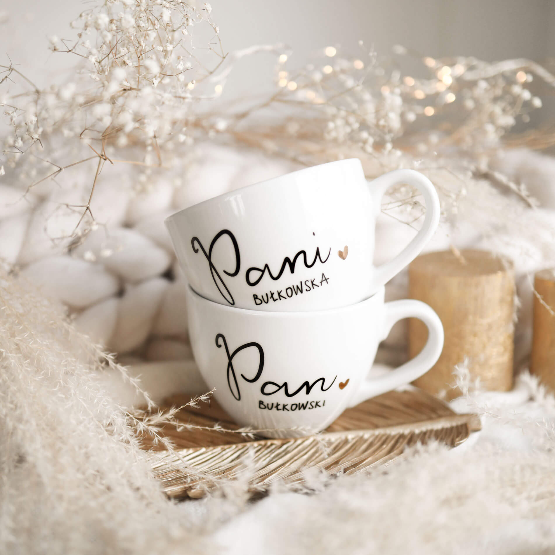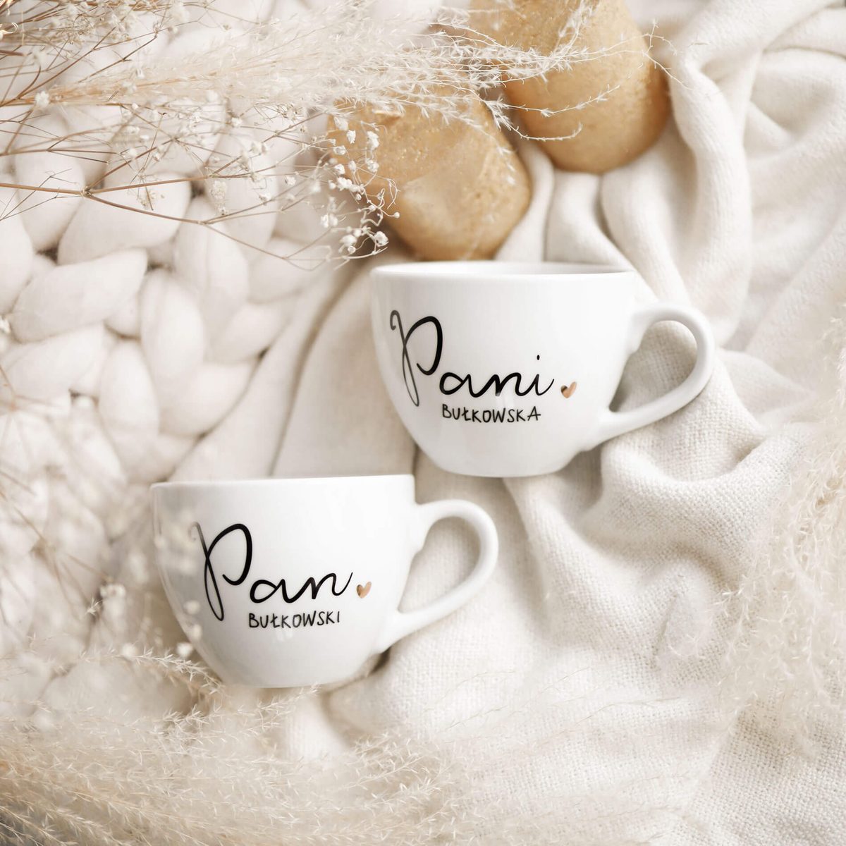 Wyobraź sobie poranek, w którym oboje sięgacie po swoje ulubione napoje i uśmiechacie się już na starcie dnia — zestaw 2 białych kubków porcelanowych z personalizacją 500 ml - motyw złotego serca z napisem „Pan i pani” oraz nazwiskiem na każdą okazję dla pary dokładnie o to dba. To duet kubków, który wygląda elegancko, a jednocześnie jest mocno „Wasz”. Personalizacja sprawia, że prezent przestaje być przypadkowy.